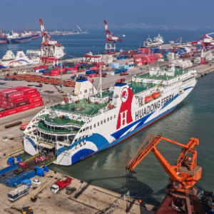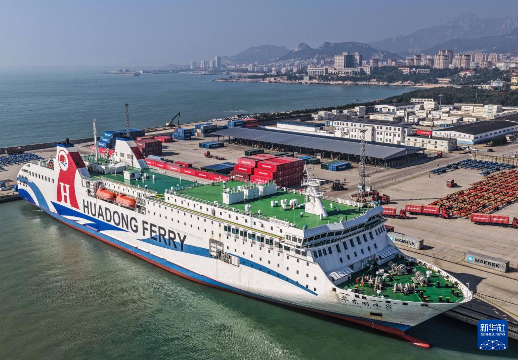 11月1日在山东省荣成市石岛管理区石岛新港口岸拍摄的外籍客货滚装船(无人机照片)。