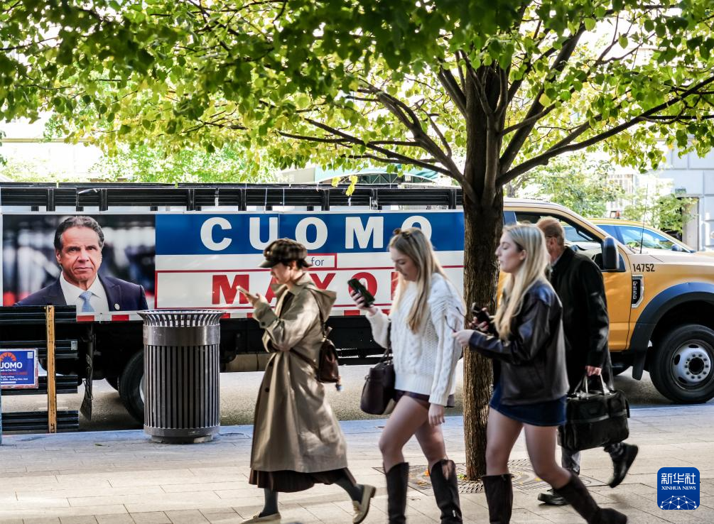 11月4日,在美国纽约,行人经过候选人安德鲁·科莫的竞选海报。