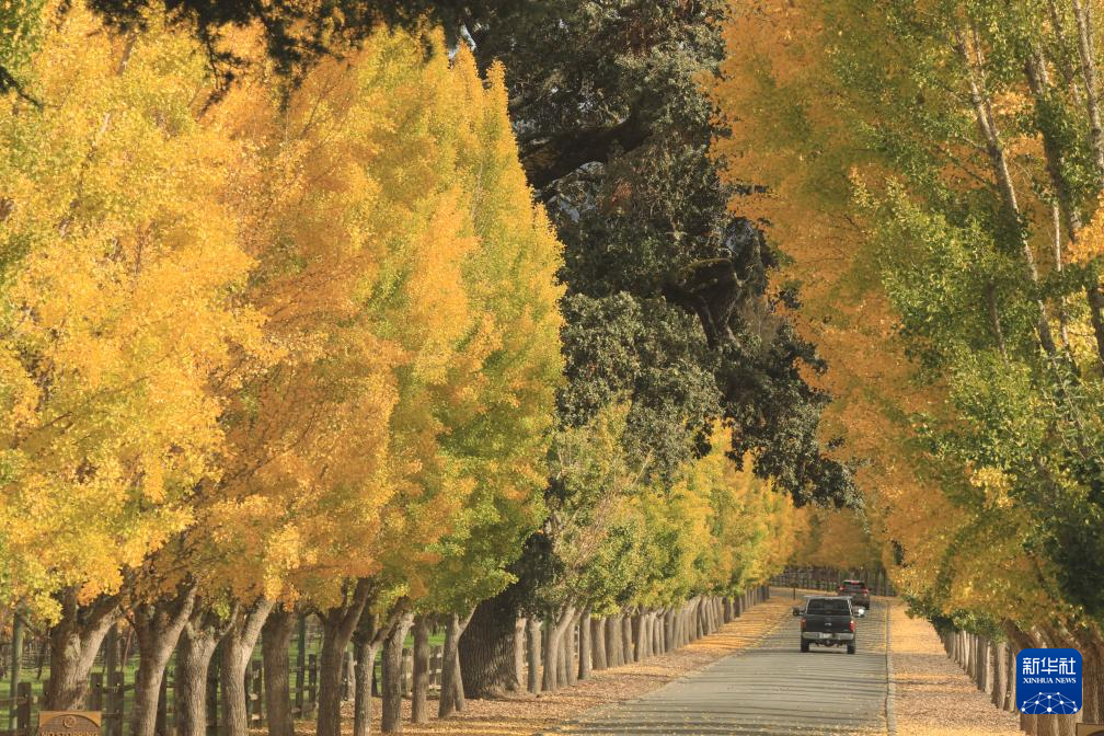 11月4日,在美国加州纳帕谷,汽车行驶在银杏大道上。