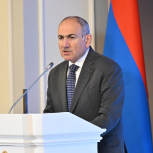 11月4日,在亚美尼亚埃里温,亚美尼亚总理帕什尼扬在“奥尔别利2025—缔造和平与多边合作”论坛开幕式上致辞。