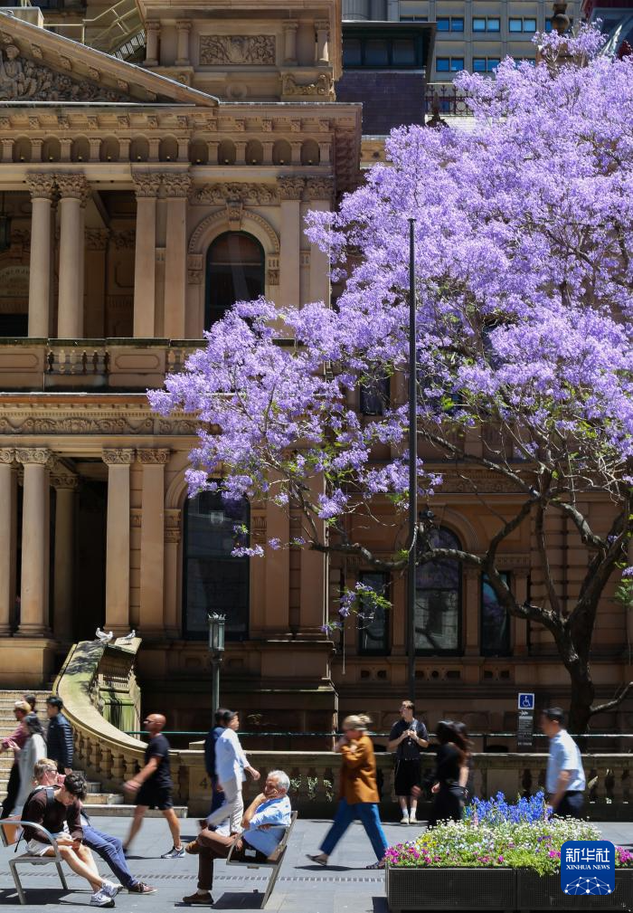 11月5日,在澳大利亚悉尼,人们从市政厅门口的蓝花楹树下走过。