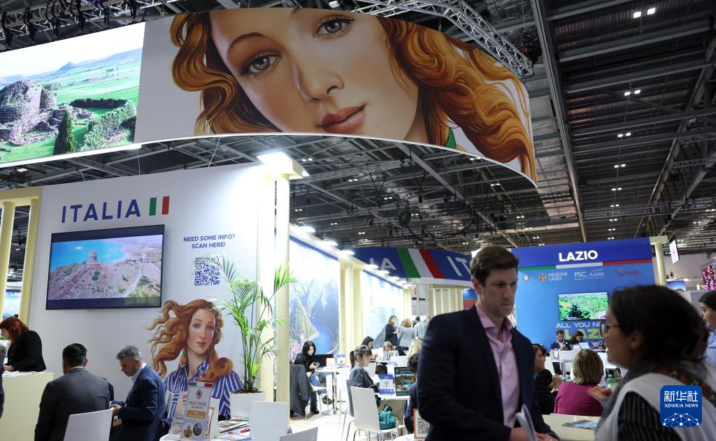 11月4日,在英国首都伦敦,人们在2025年英国伦敦世界旅游交易会意大利展区洽谈。