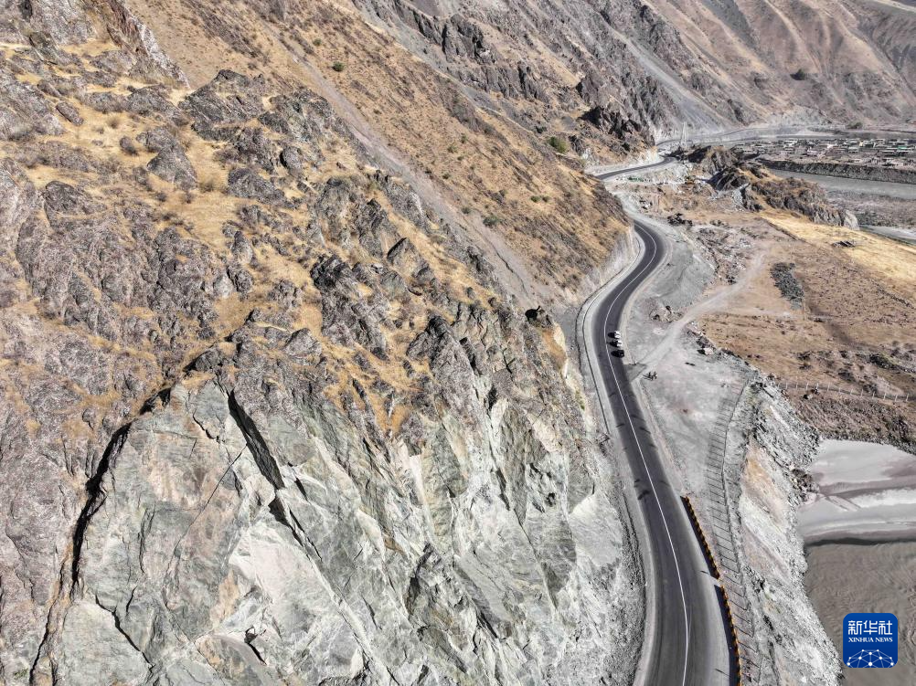 这是9月11日在塔吉克斯坦卡拉依洪姆村附近拍摄的中塔公路二期路段(无人机照片)。