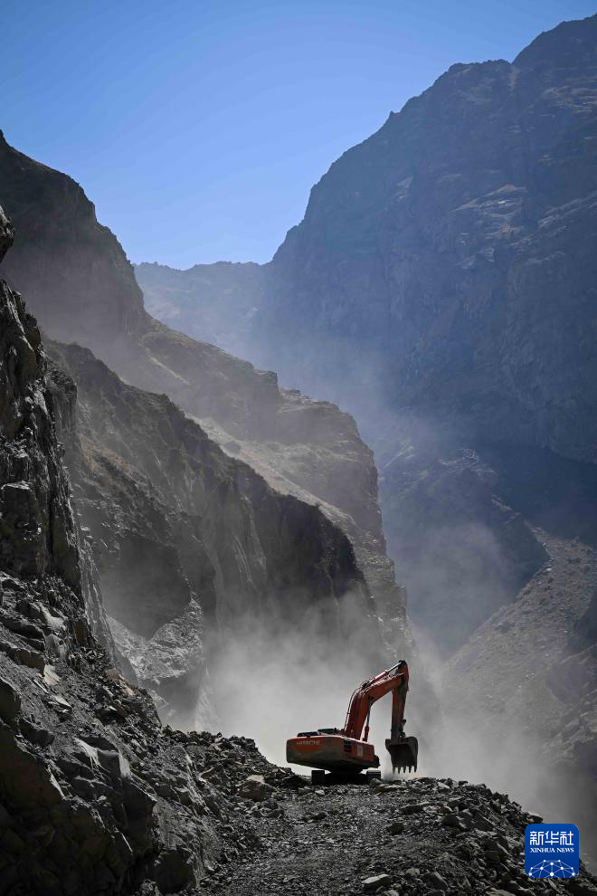 这是9月11日在塔吉克斯坦卡拉依洪姆村附近拍摄的中塔公路二期工程施工现场。