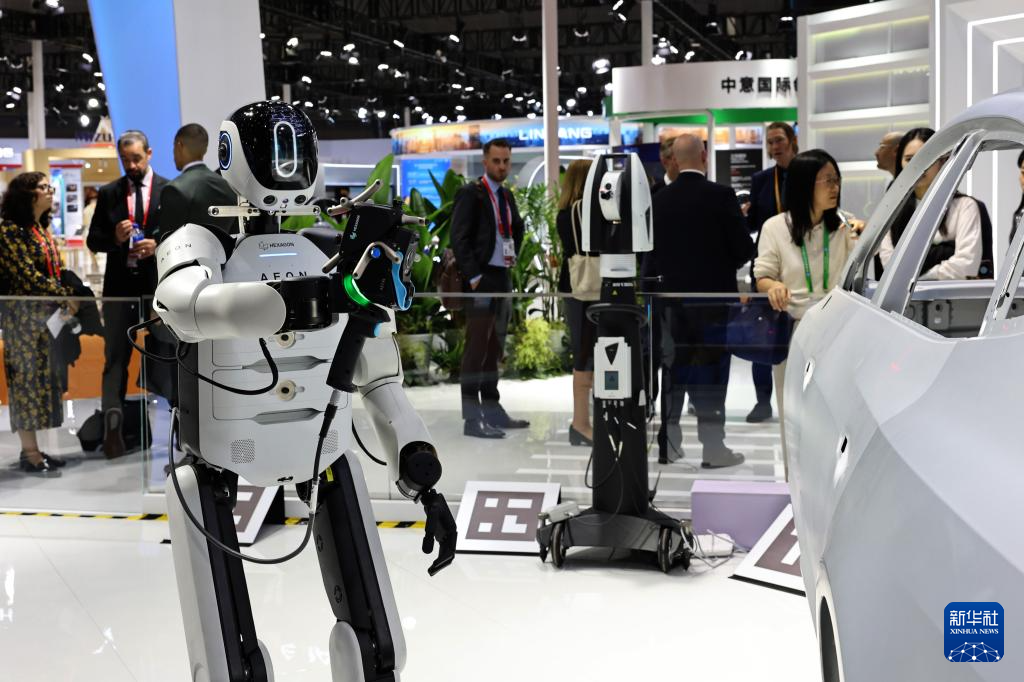 11月5日,一个海克斯康AEON工业人形机器人在展台上进行三维扫描作业演示,这也是该型号机器人工业自动化应用场景的中国首展。