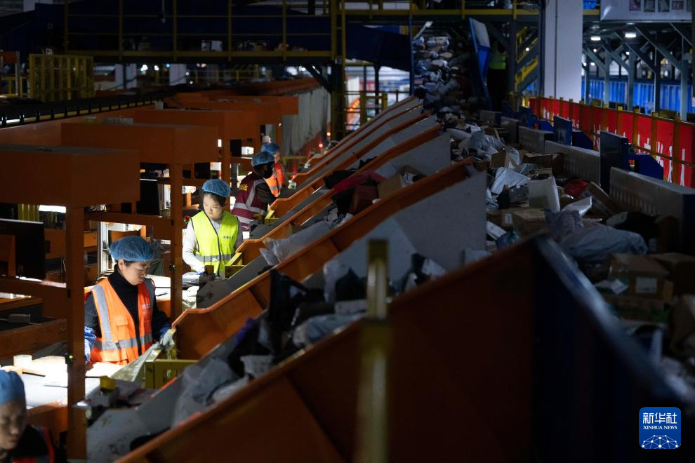 11月10日晚,在中国邮政集团有限公司黑龙江省哈尔滨邮区中心,工作人员在分拣快递。