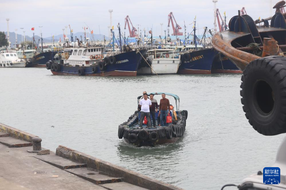 11月10日,在福建厦门高崎闽台中心渔港,从渔船上撤离下来的渔民乘坐小船准备靠岸。