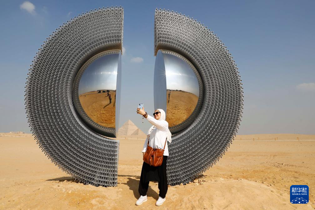 11月11日,在埃及吉萨金字塔景区,游客在“现在即永恒”国际艺术展上的一件艺术作品前自拍。