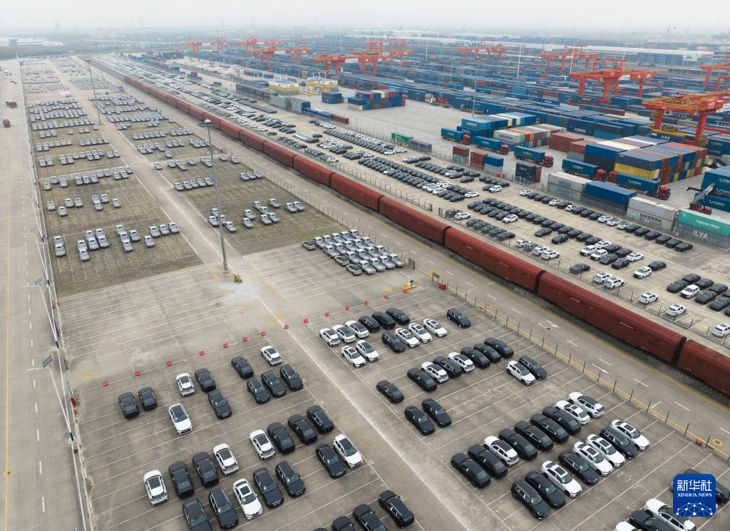 11月14日,在西安国际港站哈萨克斯坦西安码头,工人将新能源汽车驶入集装箱内。
