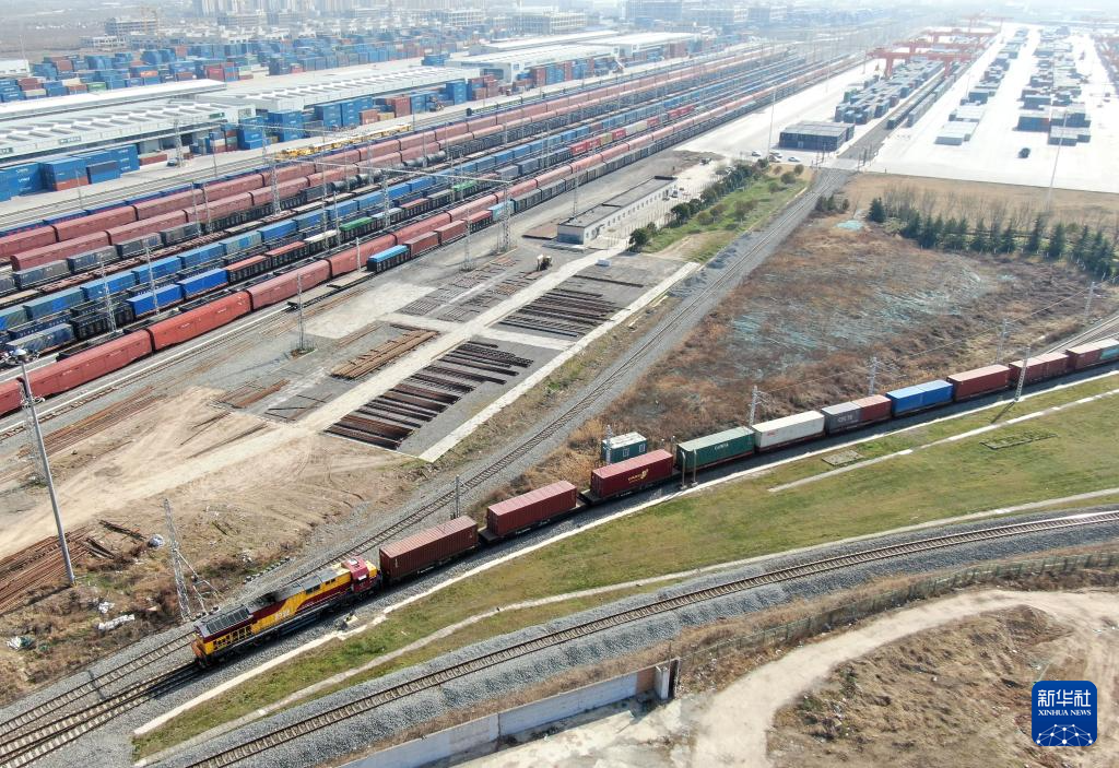 3月21日,满载货物的X8489次中欧班列从西安国际港站驶出(无人机照片)。