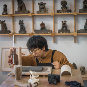 揉陶筑首,搓土成身。在昆明市古滇路转角的“心房瓦猫博物馆”内,张航伏案而坐,翻动着指尖刻刀,在陶土上勾勒出瓦猫夸张的神态。