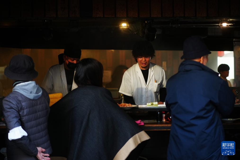 11月16日,店员在日本东京一家餐厅内为顾客服务。