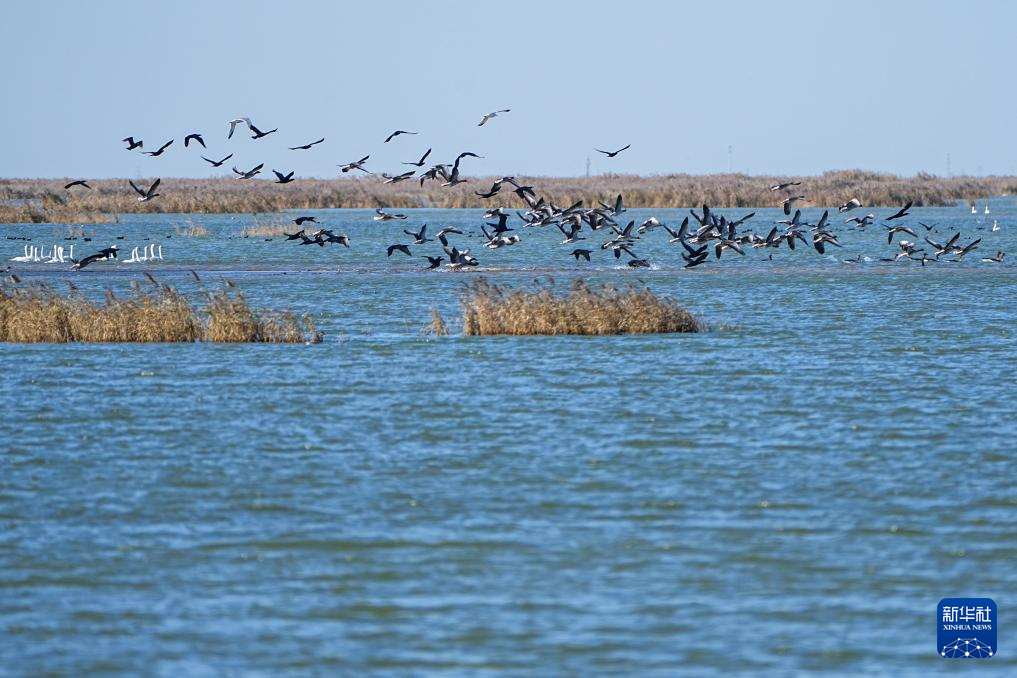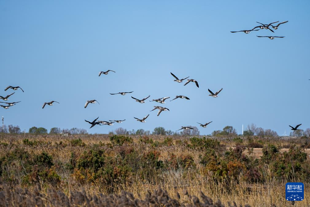11月13日,山东黄河三角洲国家级自然保护区内,越冬候鸟在飞翔。
