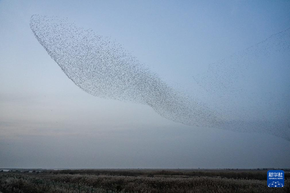 11月12日,山东黄河三角洲国家级自然保护区内,飞翔的越冬候鸟形成“鸟浪”景象。