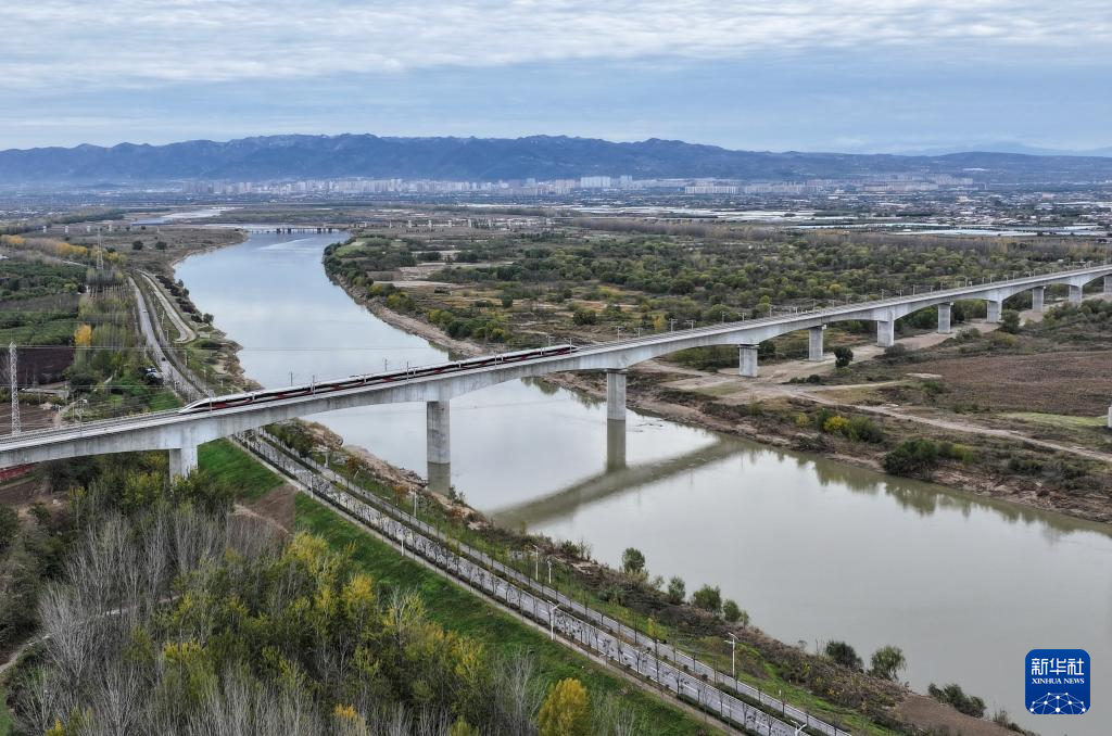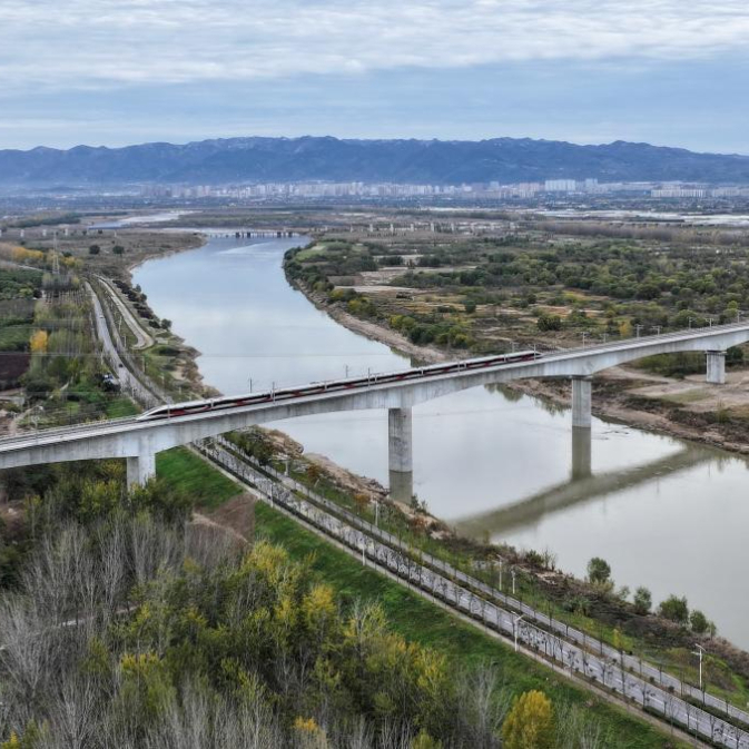 11月17日,一列试验动车组通过西延高铁渭河特大桥(无人机照片)。