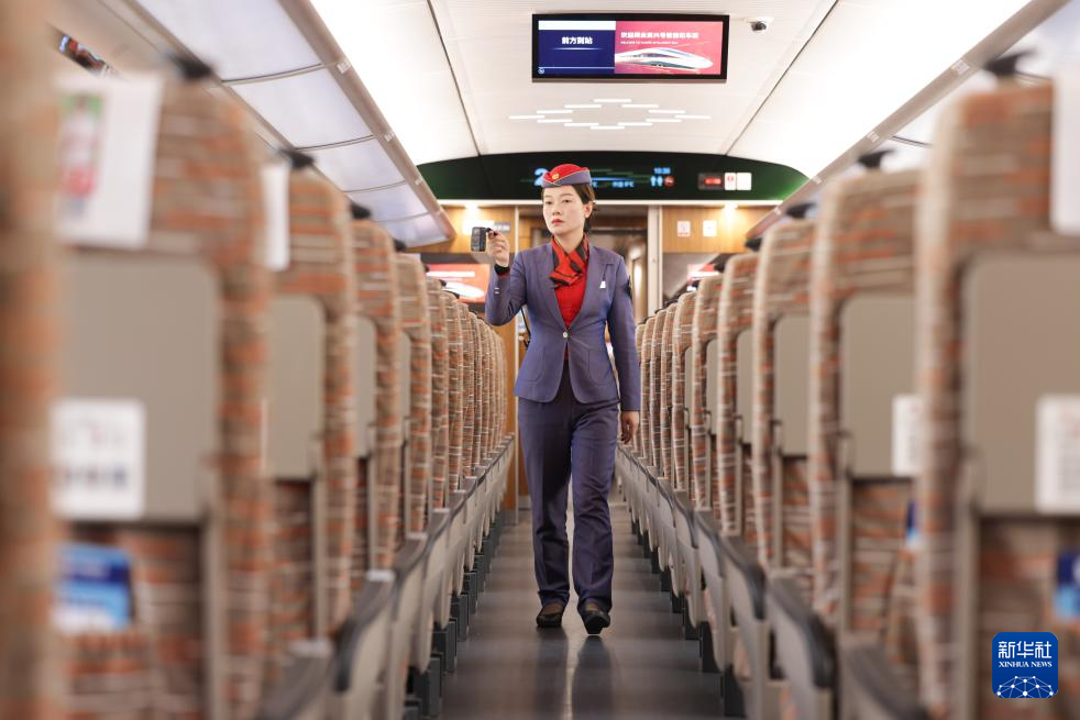 11月17日,乘务员在一列试验动车组内工作。