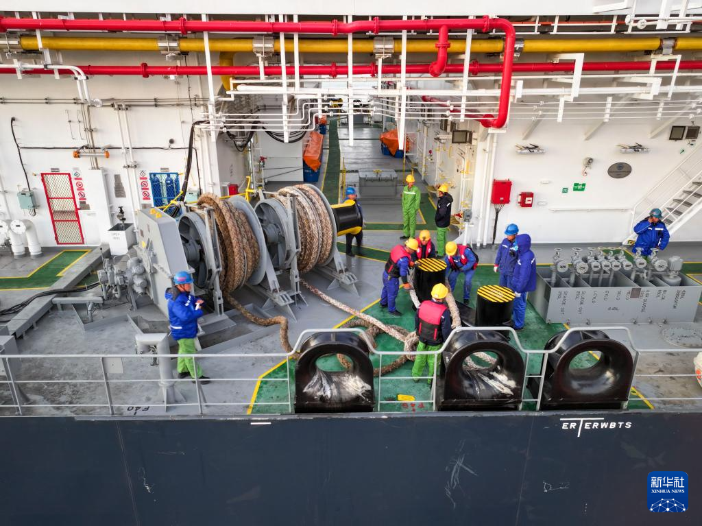 11月20日,17.5万立方米LNG运输船“鑫福124”轮停靠在江苏扬子鑫福造船有限公司码头,试航船员正收缆绳准备启航(无人机照片)。