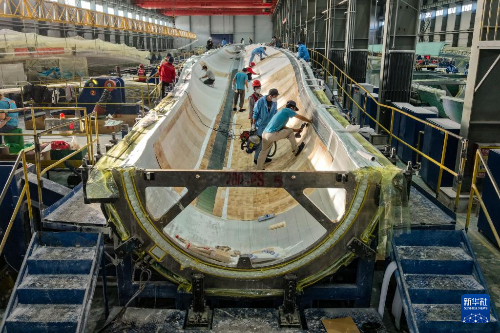 11月20日,在甘肃省酒泉经济技术开发区的甘肃九鼎风电复合材料有限公司成型车间,工作人员进行风机叶片铺层作业(无人机照片)。