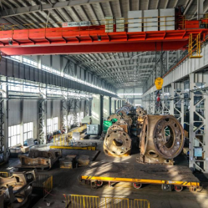 11月20日,在甘肃省酒泉经济技术开发区的日月重工(甘肃)有限公司机加车间,工作人员操作起重机转运风机轮毂(无人机照片)。