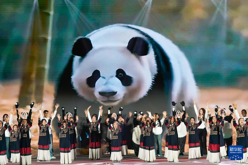 11月21日,来自大凉山的妞妞合唱团和外国留学生代表在2025全球熊猫伙伴大会开幕式上演唱大会主题曲。