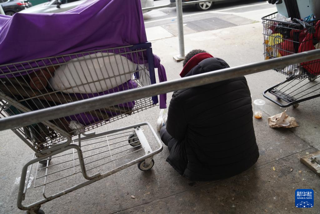 11月21日,在美国纽约一处无家可归者救助点附近,一名无家可归者露宿街头。