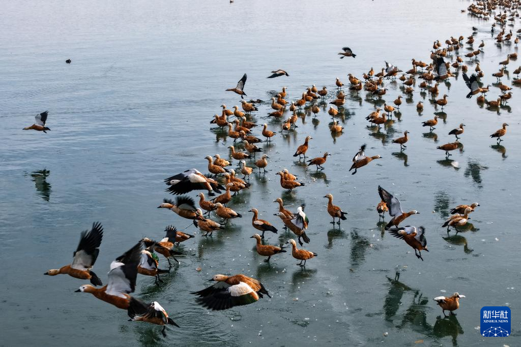 11月22日,在河西走廊东端的甘肃民勤石羊河国家湿地公园,一群赤麻鸭在红崖山水库嬉戏觅食。