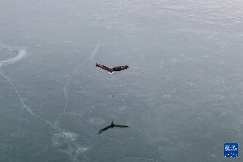 11月22日,在河西走廊东端的甘肃民勤石羊河国家湿地公园,国家一级保护野生动物白尾海雕在红崖山水库翱翔(无人机照片)。