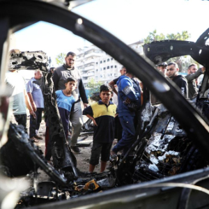 11月22日,在加沙城西部,加沙居民查看被以色列无人机炸毁的汽车。