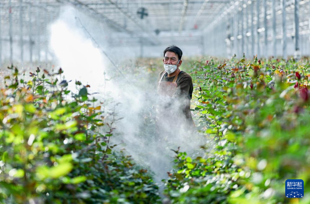 11月25日,在位于宁夏银川市兴庆区大新镇的农业高科技智慧示范园内,工人为花卉浇水。