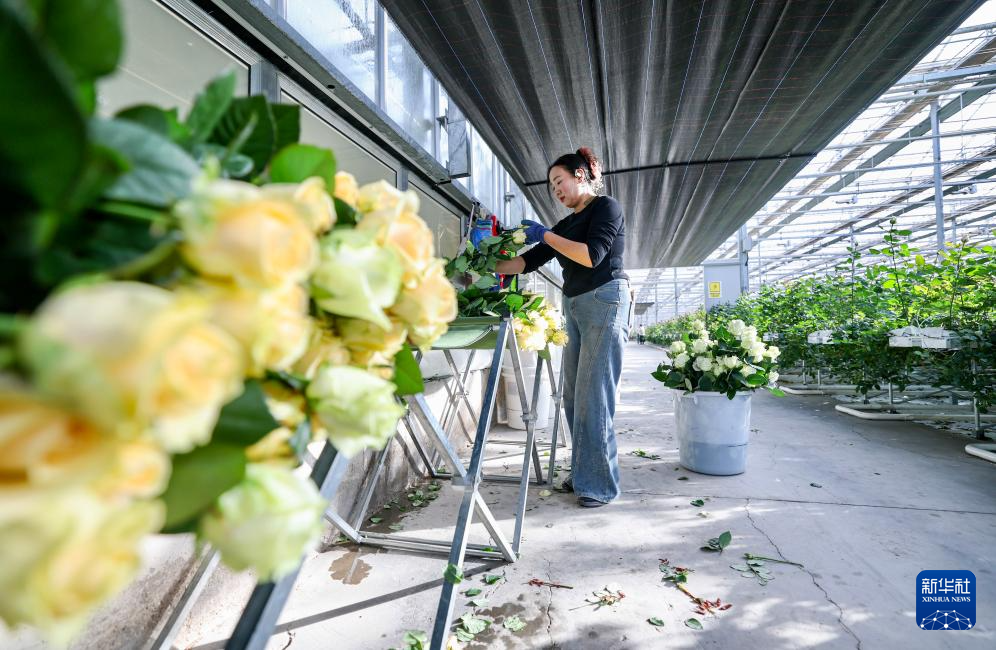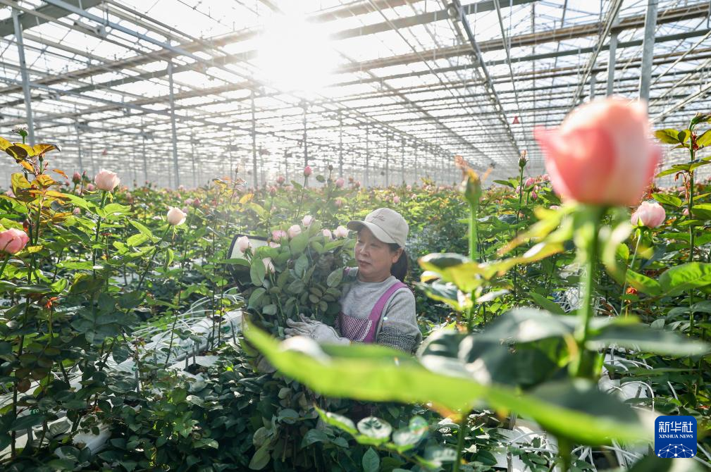 11月25日,在位于宁夏银川市兴庆区大新镇的农业高科技智慧示范园内,工人在采摘玫瑰。
