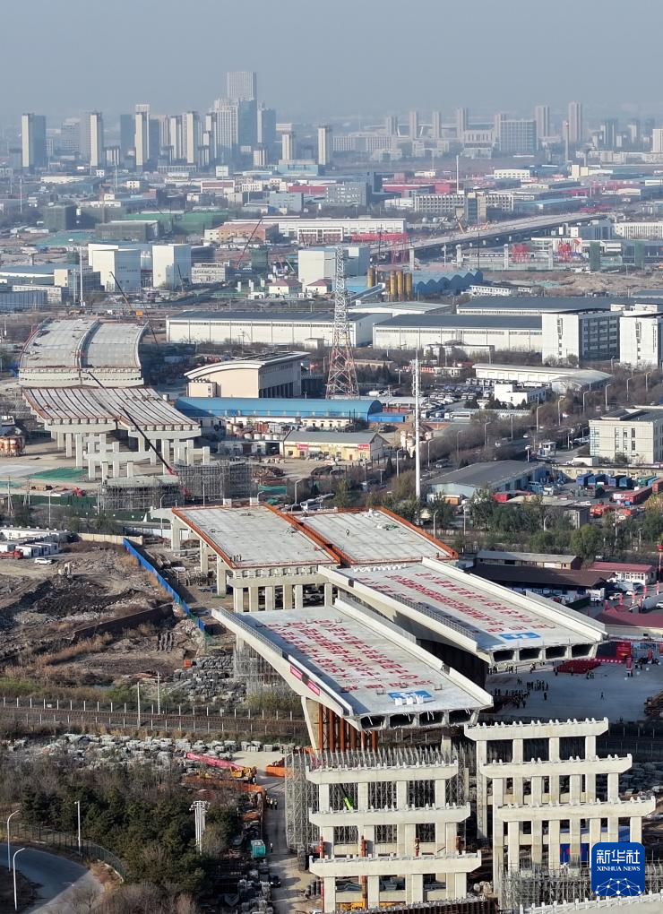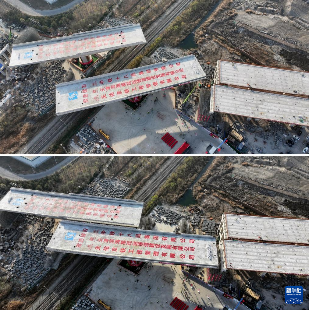 11月26日拍摄的兴港高速上跨津山铁路转体桥施工现场(拼版照片,无人机照片)。