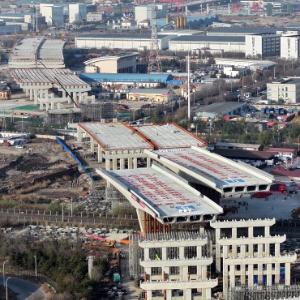 11月26日,由天津滨海建投基建管理有限公司负责建设的兴港高速上跨津山铁路转体桥工程完成转体施工。工程承建方中铁十八局仅耗时约1小时便将两座重1.4万吨的转体连续梁,同步顺时针旋转60余度实现“完美转身”。