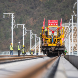 11月27日,在湖北十堰神定河特大桥上,西安至十堰高速铁路(简称“西十高铁”)全线最后一对长钢轨铺设落地,标志着西十高铁全线铺轨工程顺利完工,为后续联调联试奠定基础。