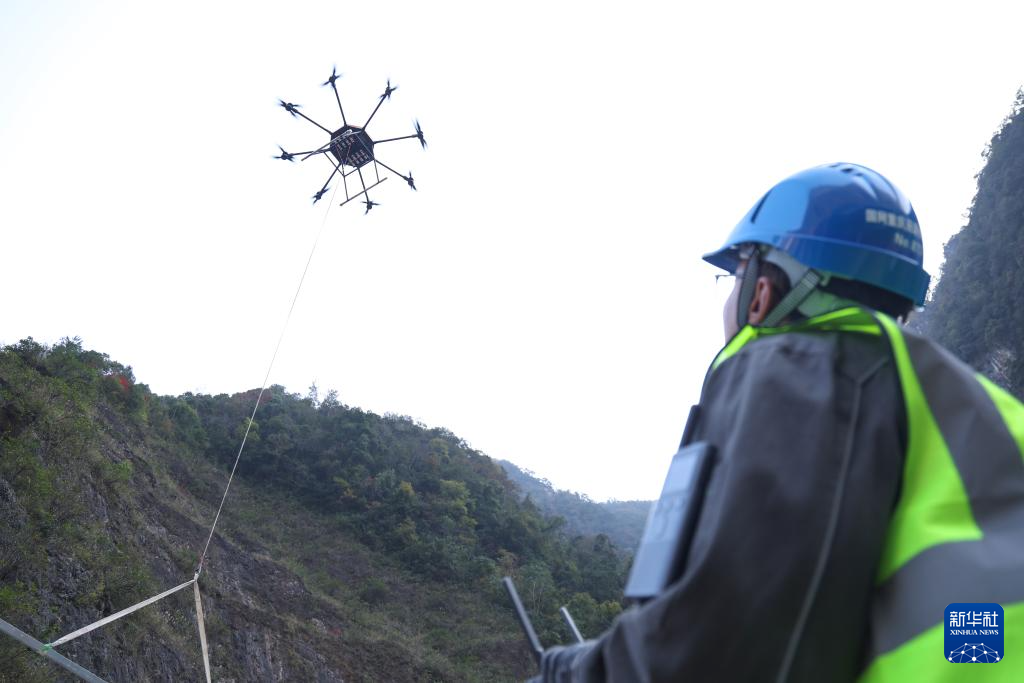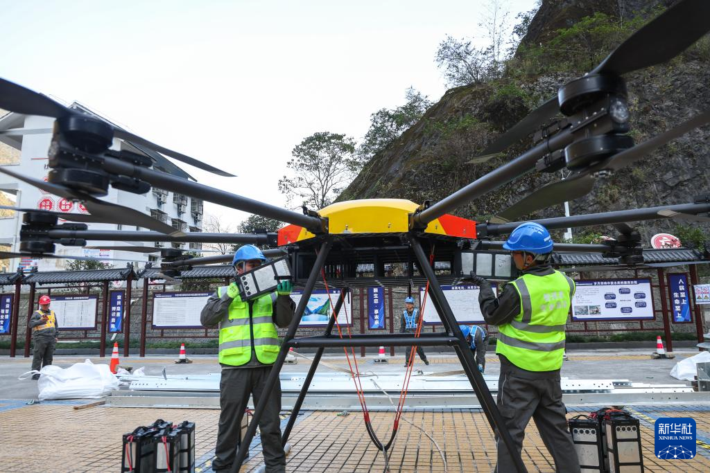 11月27日,在重庆市巫溪县中梁乡35千伏西土线改造现场,现场工作人员操作重载无人机吊运新建铁塔塔材。