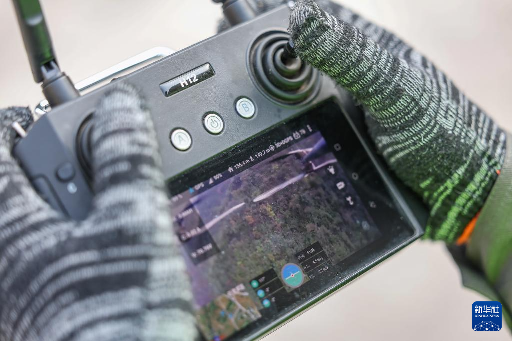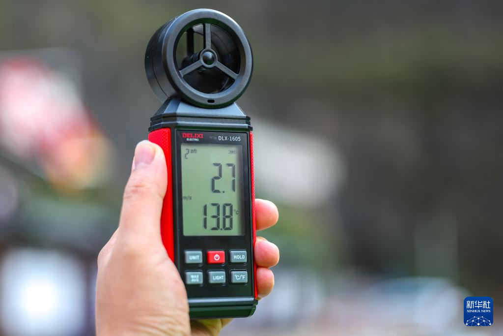 11月27日,在重庆市巫溪县中梁乡35千伏西土线改造现场,现场工作人员利用风速测量仪监测无人机起降的作业条件。