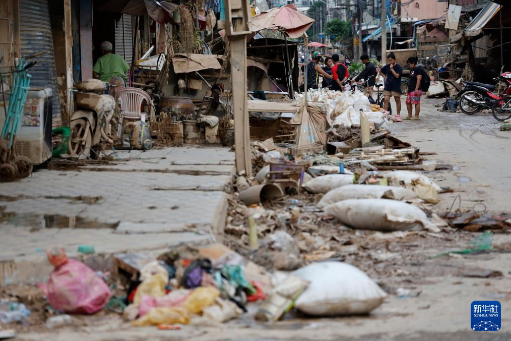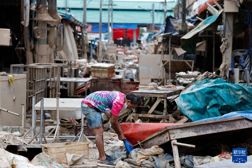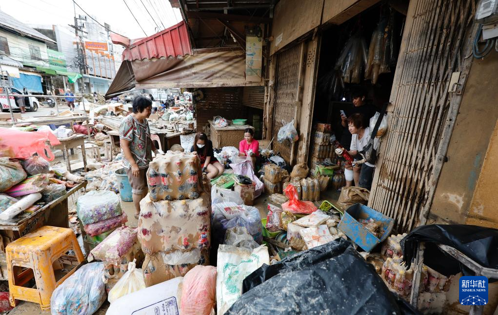 11月28日,在泰国宋卡府合艾市街头,当地居民在一家店铺整理沾染污泥的商品。