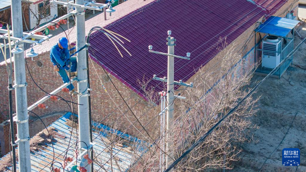 11月27日,当地供电部门工作人员在宁夏吴忠市同心县河西镇旱天岭村进行“煤改电”配套供电工程施工。