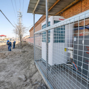 这是11月27日在宁夏吴忠市同心县豫海镇园艺村拍摄的一户村民家的空气能采暖设备外机。