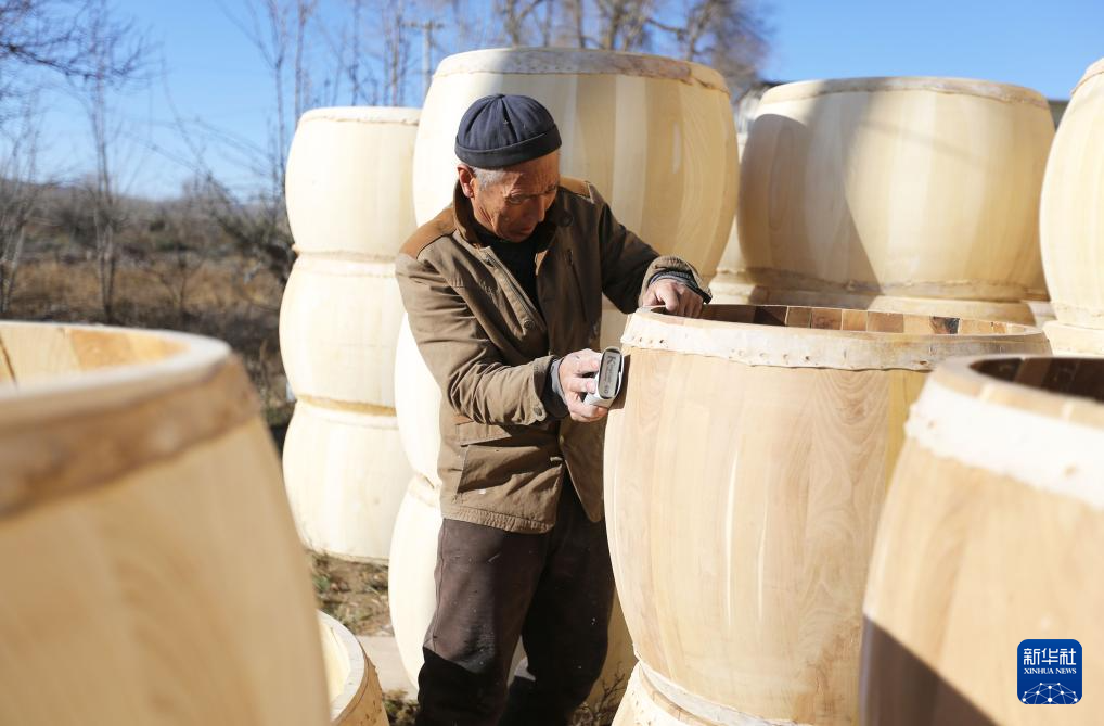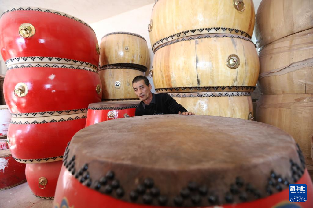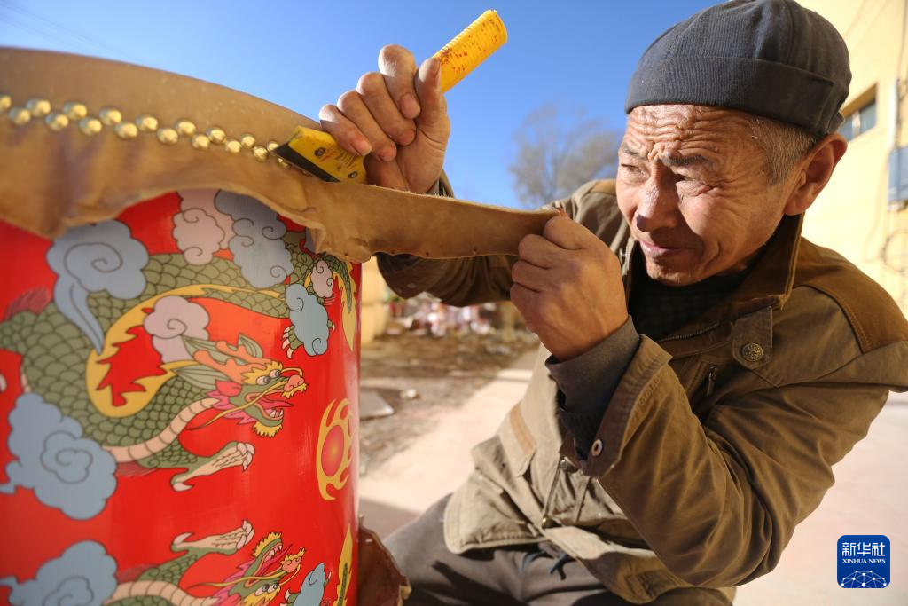 冬日农闲时节,在甘肃省定西市安定区凤翔镇北廿铺村,牛皮鼓手工制作艺人利用晴好天气赶制订单牛皮鼓,供应市场。该村每年可制作各类牛皮鼓3000余面,牛皮鼓手工制作涵盖选材、解板、刨制鼓腔、蒙皮、钉钉等多道工序,再经数天晾晒和反复调试才能最终制成。牛皮鼓是我国的传统打击乐器,在西北地区用于民间社火表演等活动。