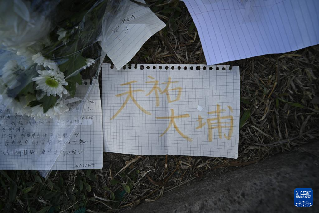 这是11月29日清晨在火灾后的大埔宏福苑楼宇附近拍摄的市民摆放的花束与留言条。