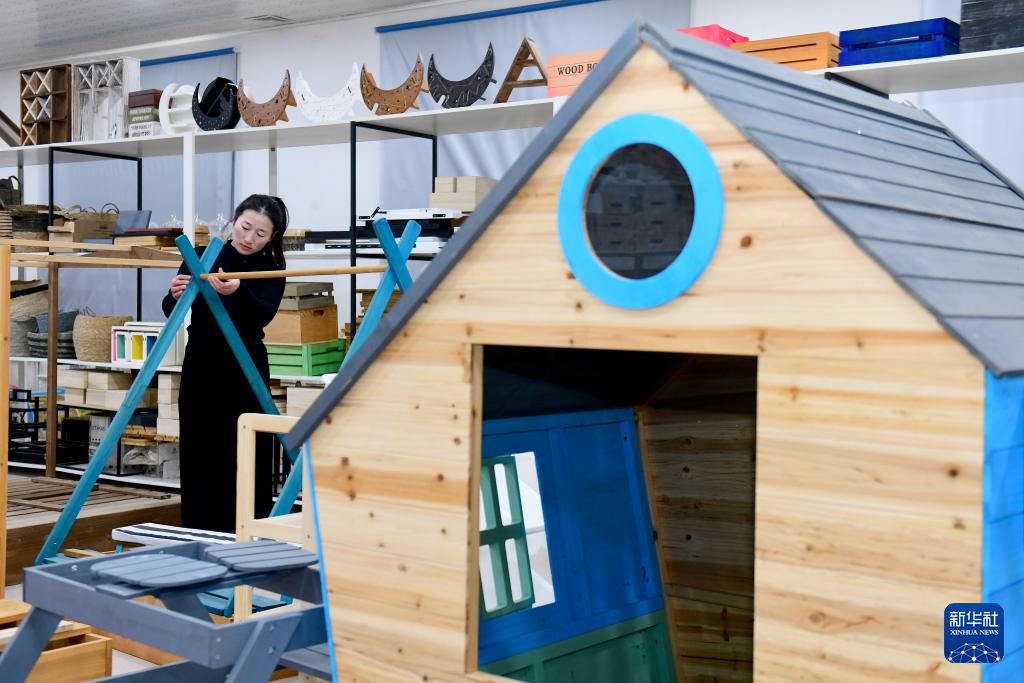 11月28日,在曹县鹏辉工艺品有限公司,工作人员在展厅组装宠物家居。