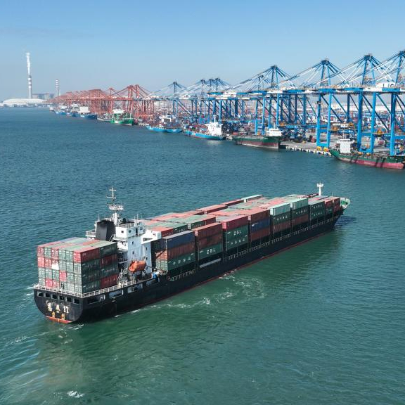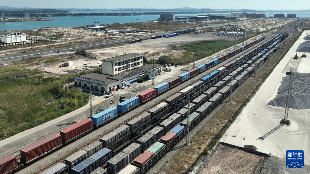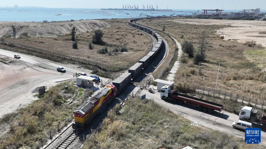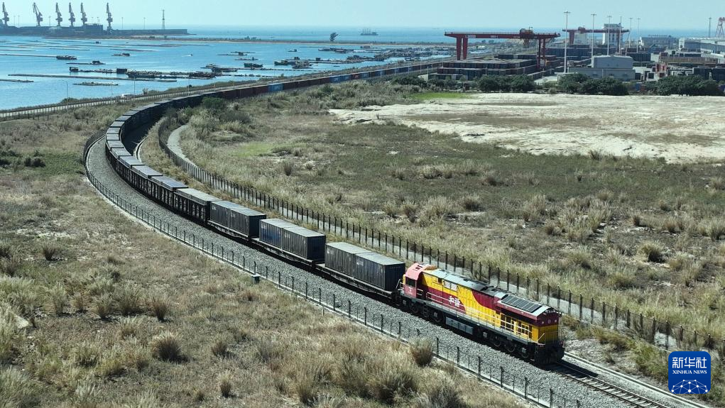 11月29日拍摄的满载集装箱的铁海联运班列(无人机照片)。