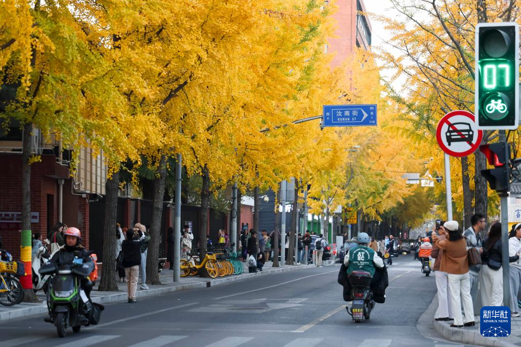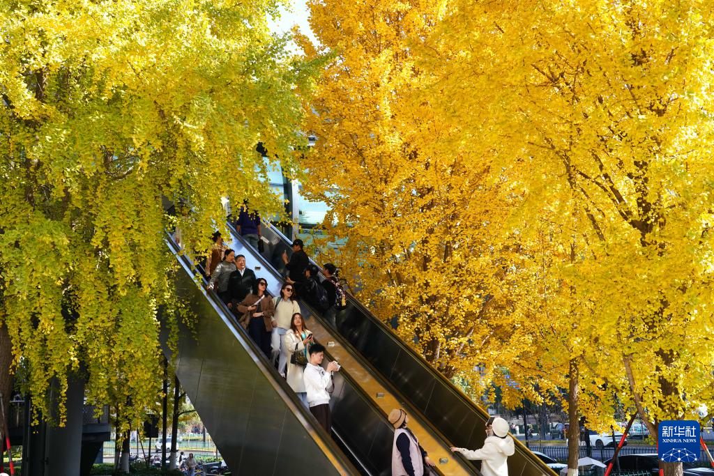 11月30日,人们在浙江省杭州市环城北路一处位于银杏间的自动扶梯上打卡拍照。