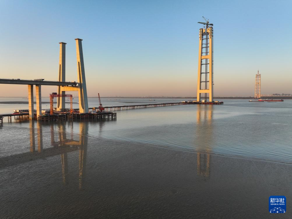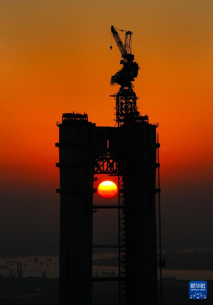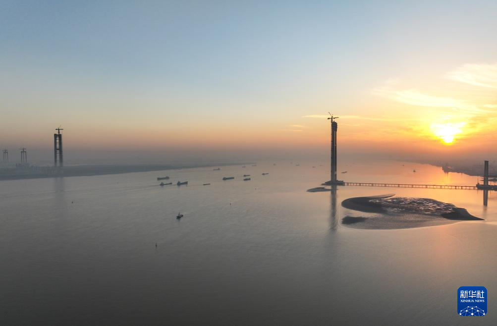 日出时分拍摄的张靖皋长江大桥南航道桥南主塔施工现场(11月30日摄,无人机照片)。