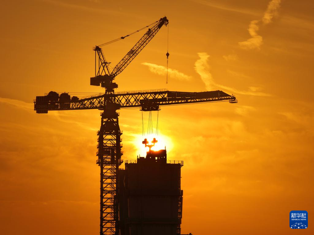 日落时分拍摄的张靖皋长江大桥南航道桥南主塔封顶施工现场(11月29日摄,无人机照片)。