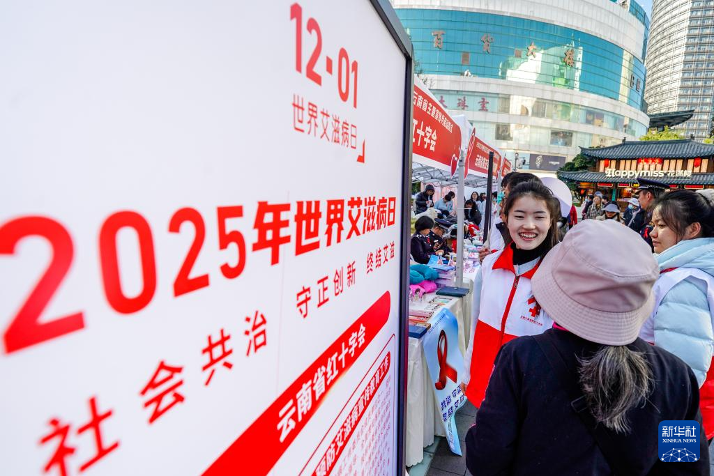 12月1日,工作人员在昆明市南屏广场举办的2025年世界艾滋病日云南省主题宣传月启动仪式上为市民普及防艾知识。