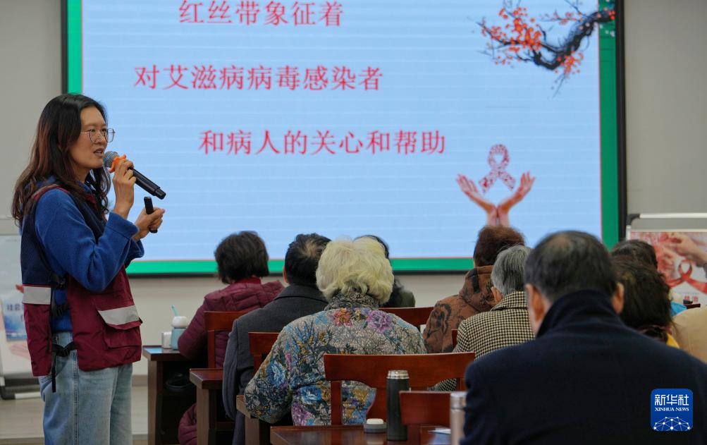 12月1日,江苏省海安市疾控中心高新区分中心工作人员为海安老年大学高新区分校老年学员介绍红丝带的意义。