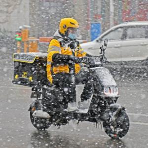 12月2日,外卖员在山东省烟台市福山区街头冒雪出行。