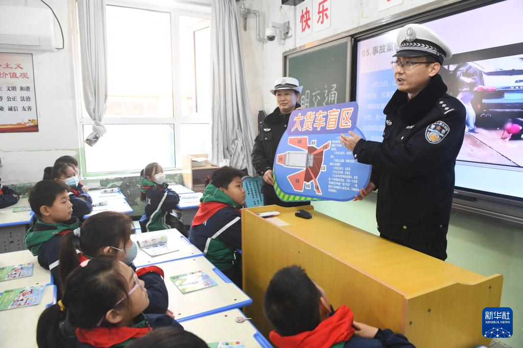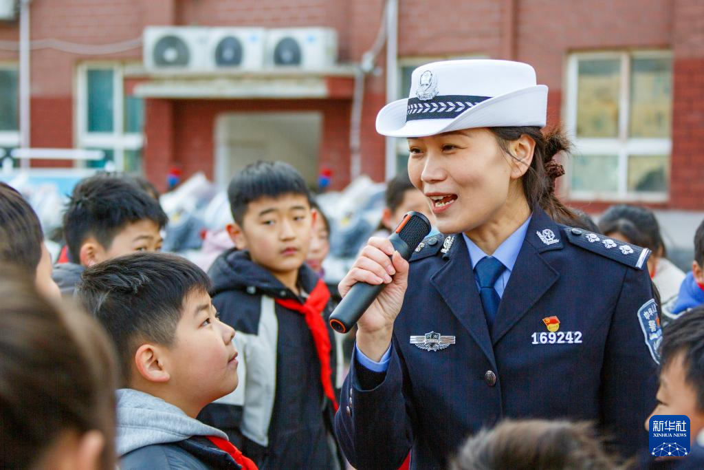 12月2日,在河北省石家庄新乐市实验小学,民警给学生普及交通避险知识。