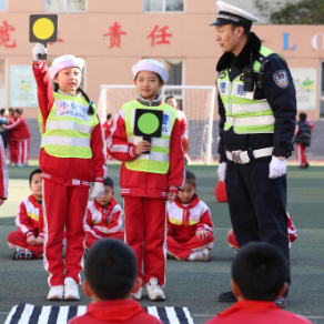 12月2日,在山东省青岛市市北区东胜路小学,交警指导学生学习交通标志。